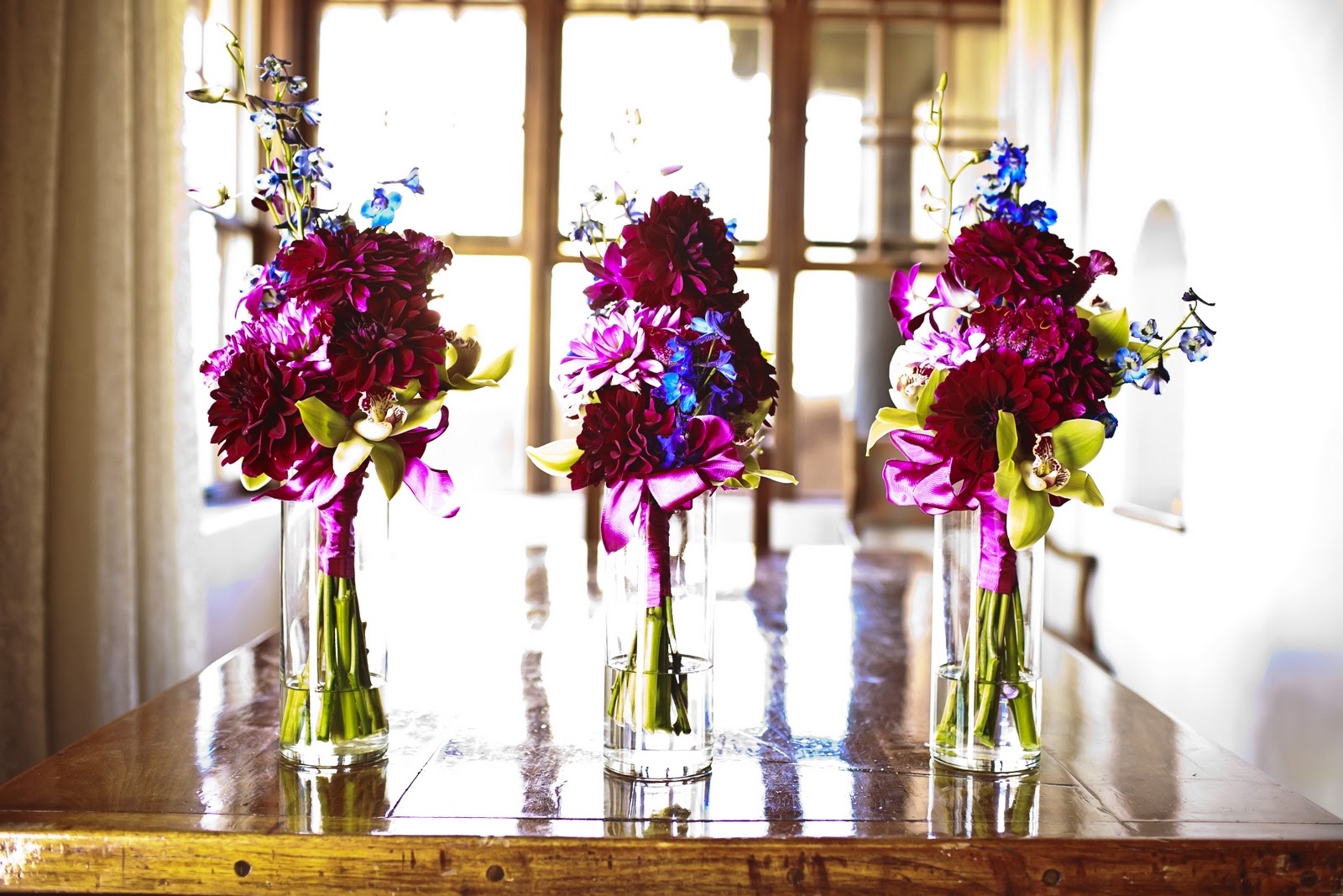 It's wintery and wonderful! The centerpieces are splashed with the silver and pewter of Brunia Berries and Leucadendron pods, ivory Hydrangeas and cream Polo roses and just a touch of purple Privet Berry. It is warmed up with the most beautiful dusty pink rose called Quicksilver, ooooeee!